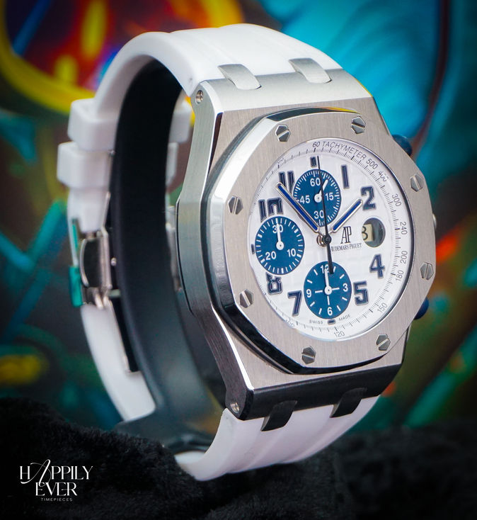 The 42mm stainless steel case features AP’s signature octagonal bezel secured with white gold screws, while the white “Méga Tapisserie” dial provides a striking contrast to the navy blue subdials and tachymeter scale—earning this model its “Panda” nickname. Complemented by a blue rubber strap (with an additional Horus strap included), the watch balances presence and wearability.