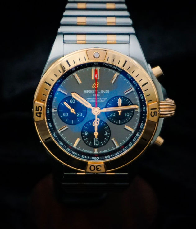The Breitling Chronomat 42 Ref. UB0134101B1U1 blends rugged sport functionality with refined elegance in a perfectly balanced two-tone design. Measuring 42mm in diameter, the case is crafted from stainless steel with an 18k red gold bezel and crown accents, adding luxurious contrast to the sleek grey dial.