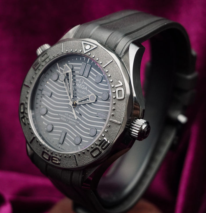 The Omega Seamaster Diver 300M Ref. 210.92.44.20.01.003 is a sleek, modern dive watch crafted from black ceramic, offering a bold aesthetic with high-performance capability. Measuring 42mm, this timepiece features a laser-engraved black wave dial, black ceramic bezel with white enamel diving scale, and a matching black rubber strap for a stealthy, unified look.